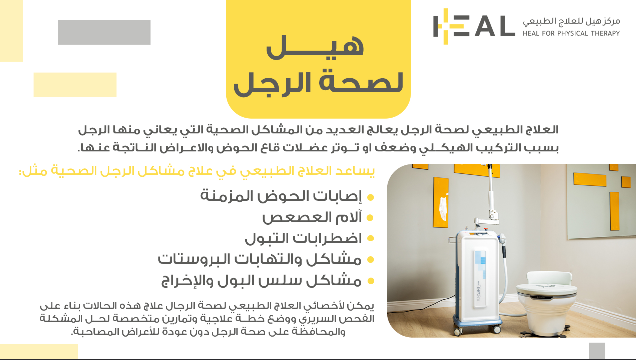 العلاج الطبيعي لصحة الرجل يعالج العديد من المشاكل الصحية التي يعاني منها الرجل بسبب التركيب الهيكلي وضعف او توتر عضلات قاع الحوض والاعراض الناتجة عنها.